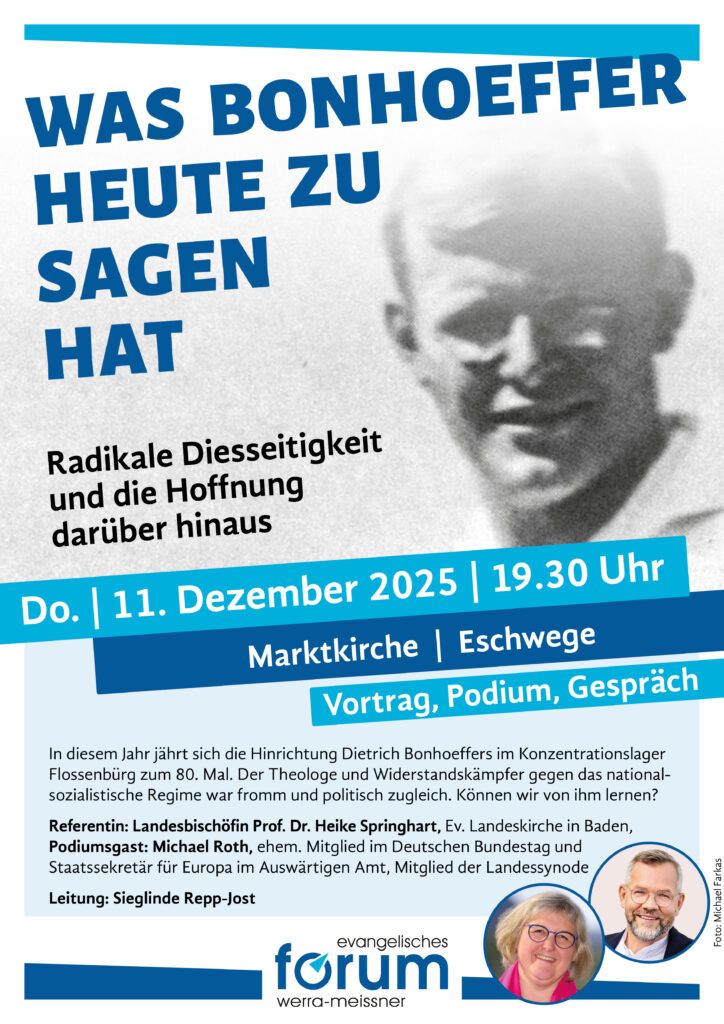 Am Donnerstag, 11. Dezember 2025 lädt das Evangelische Forum Werra-Meißner ein zu einem besonderen Abend über den Theologen und Widerstandskämpfer Dietrich Bonhoeffer, der vor 80 Jahren im Konzentrationslager Flossenbürg hingerichtet wurde.